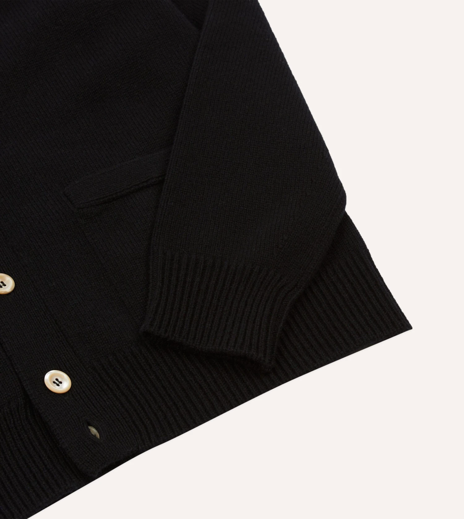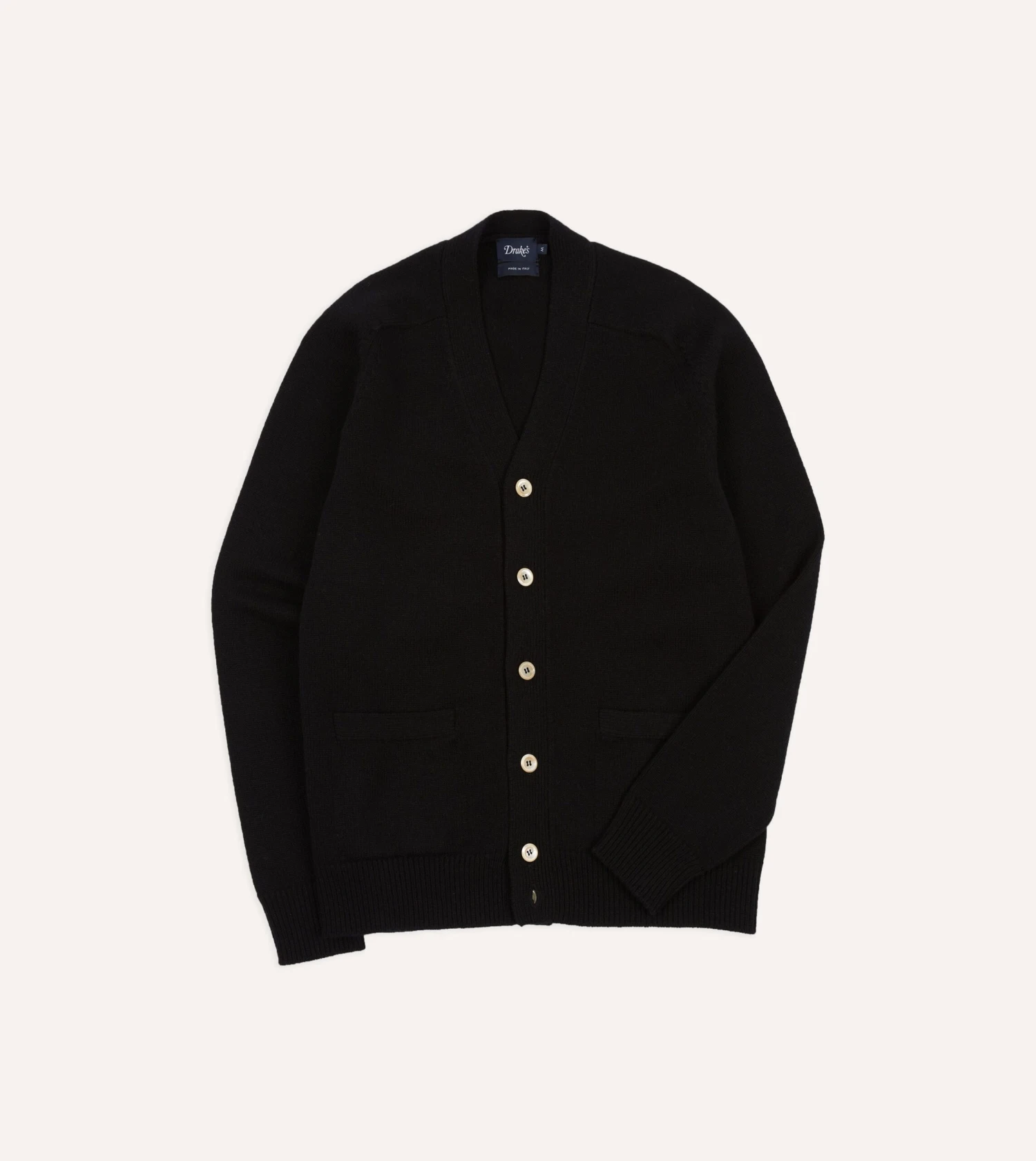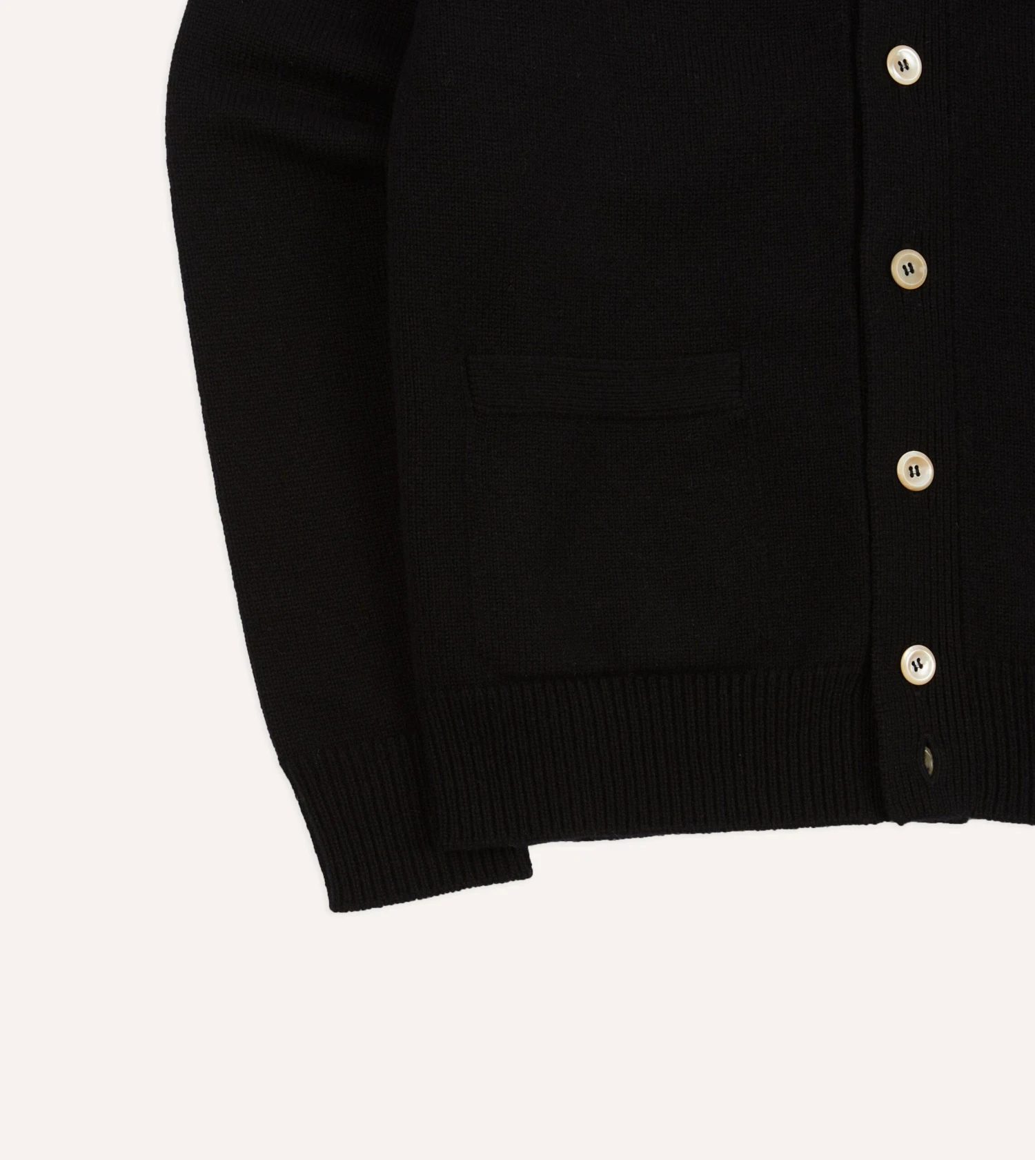 With ribbed hems and twin patch front pockets, the functional nature of this classic cardigan is elevated by mother of pearl values and saddle shoulders for a more relaxed silhouette.