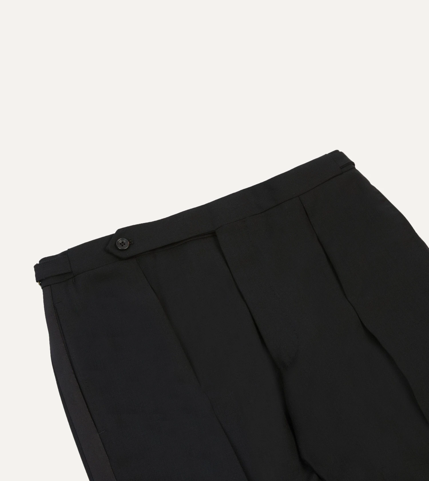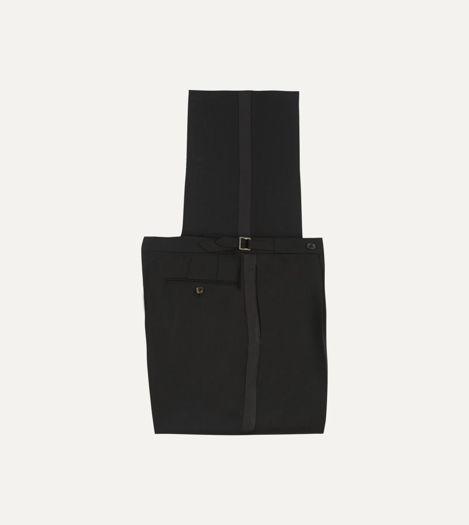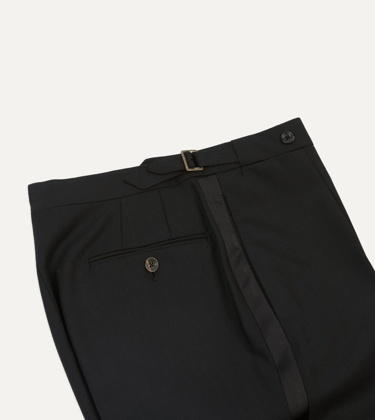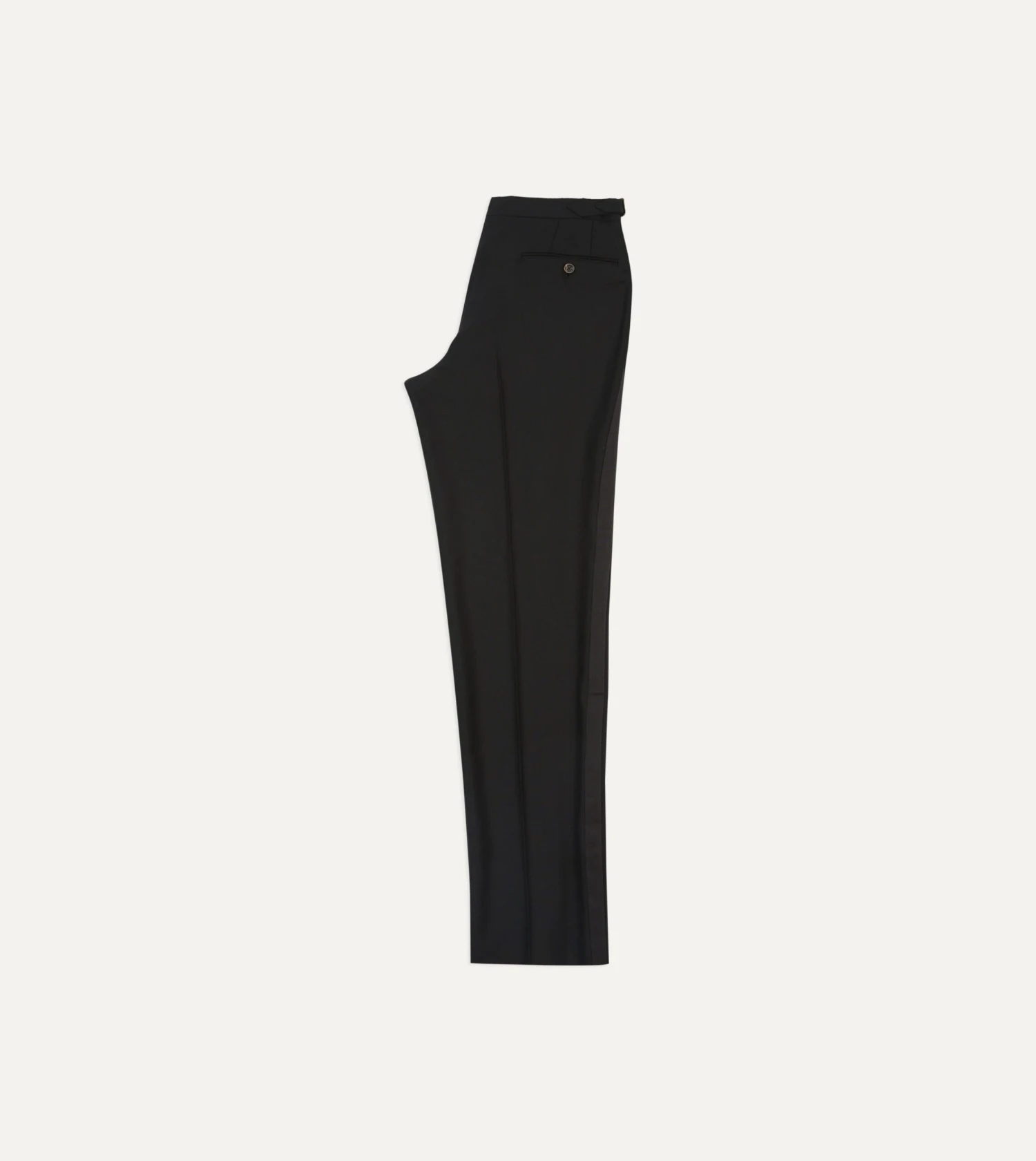 Crafted from a tropical merino wool, the half-lined trousers feature understated details such as an extended tab front, French bearer valueing with interior waistband curtaining, an after-dinner split to the rear, and side adjusters in lieu of belt loops.