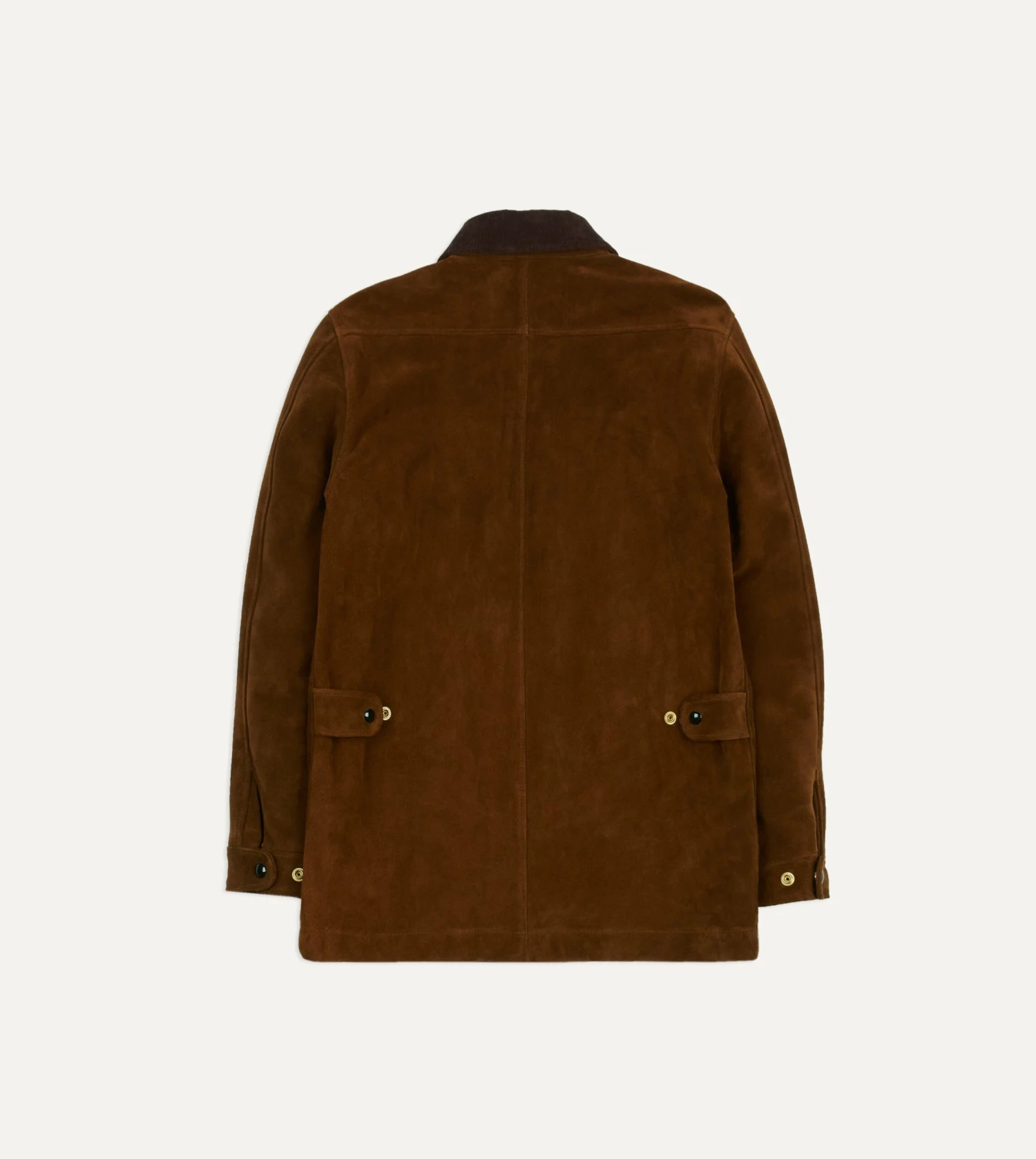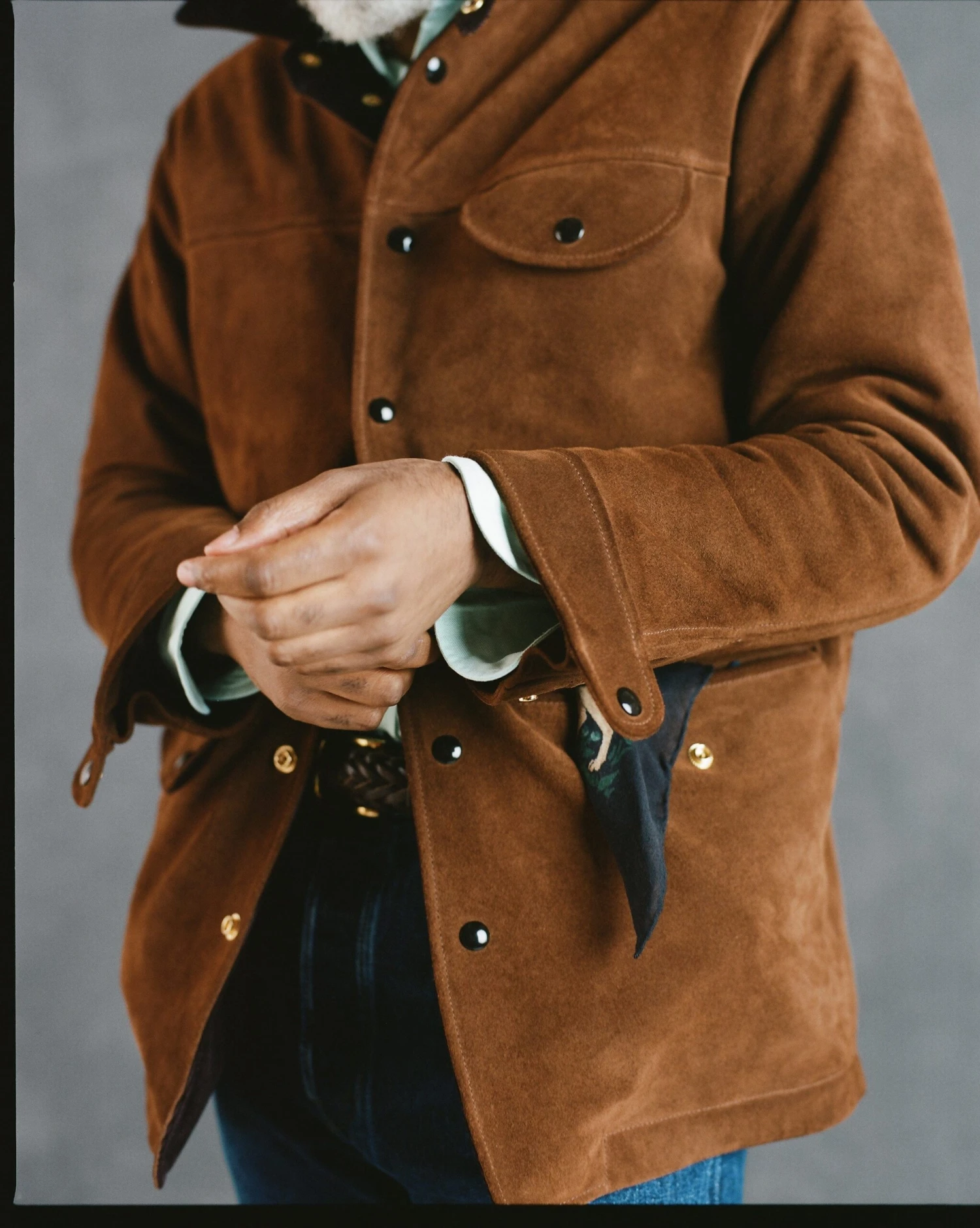 The car coat is our interpretation of a classic silhouette. We took inspiration from WW2 flight jackets, as well as heavyweight civilian coats, in our efforts to make what is – to our minds at least – the perfect mid length coat. It’s constructed in Tuscany from an extraordinary, substantial suede, with a cotton blanket lining, and the hide’s smooth suede side facing out in typical fashion. It is finished with prominent stud values, as well as the distinct leather strapping found on the finest vintage examples of leather outerwear. With a generous collar and a simple, straight shape, it is a beautiful example of when form and function meet.Â