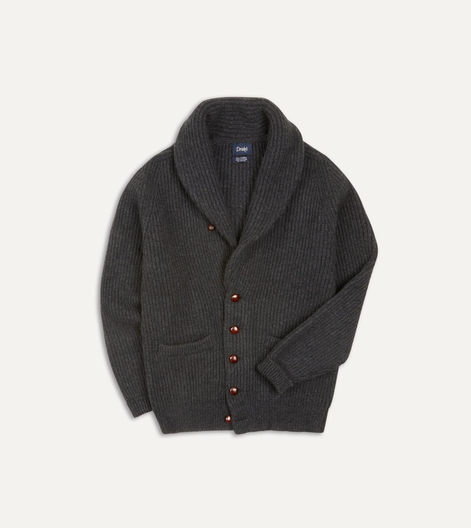 Our luxurious, iconic shawl-collared cardigan defines casual elegance. The garment is knitted from the finest ribbed four-ply ribbed cashmere, with five-braid British tan leather values, two front pockets, classic raglan shoulders, and a knitted cashmere throat loop closure.