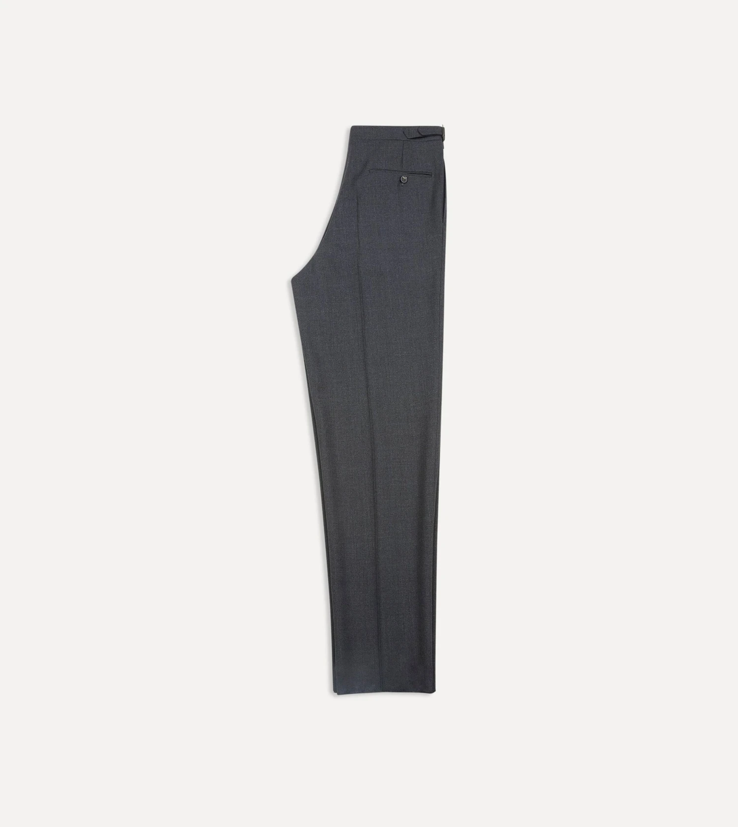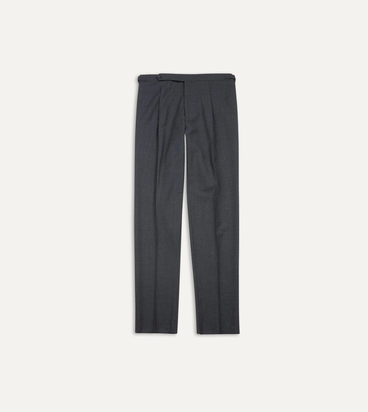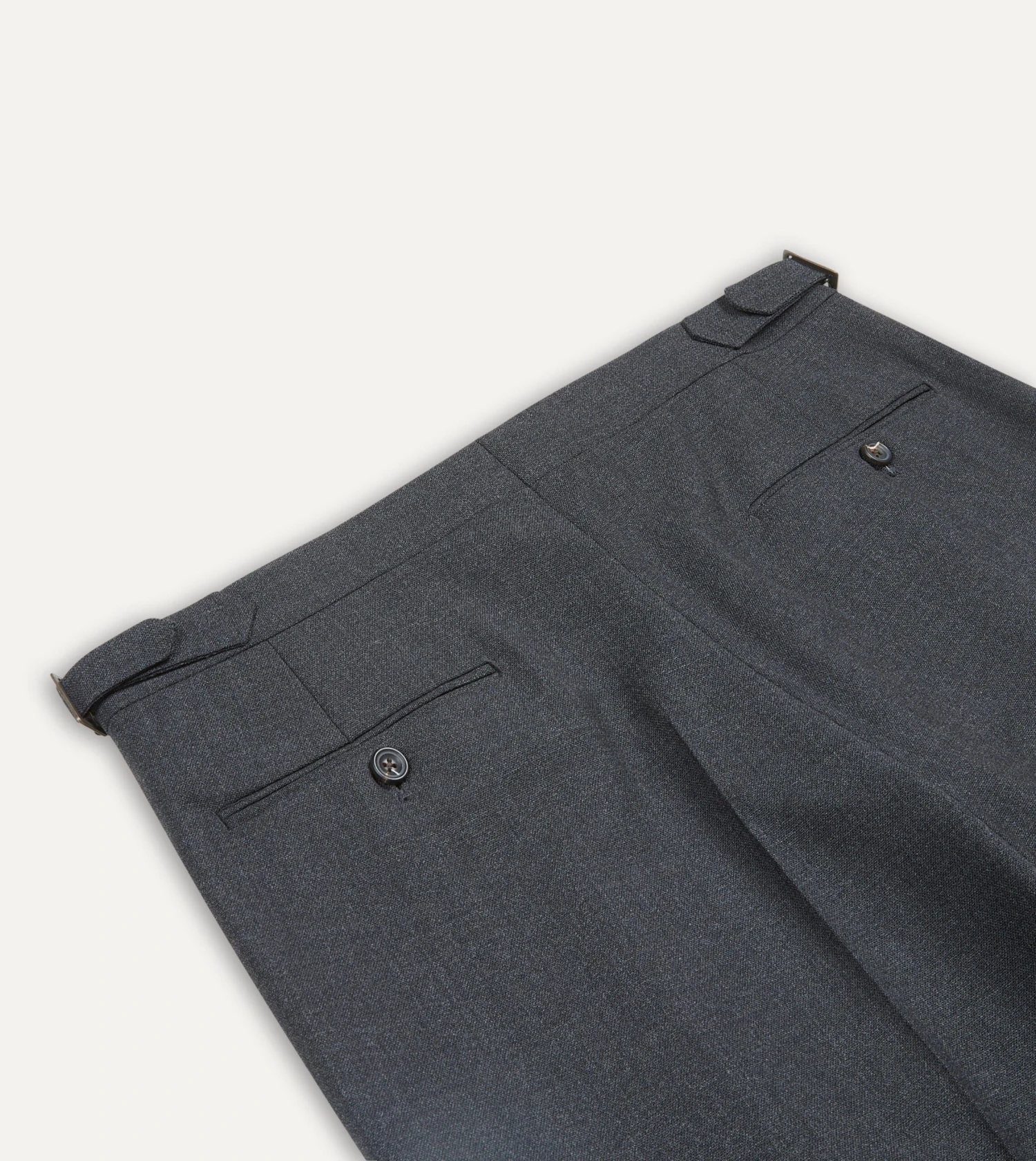 Crafted from a high-twist tropical merino wool, the half-lined trousers feature understated details such as an extended tab front, French bearer valueing with interior waistband curtaining, an after-dinner split to the rear, and side adjusters in lieu of belt loops.