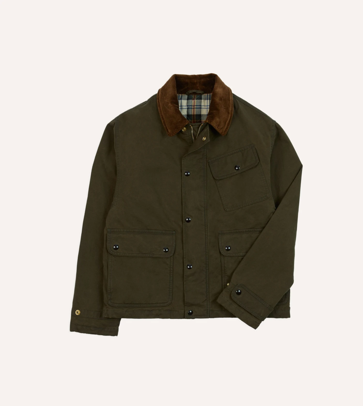 Made in Italy from Scottish waxed cotton, the Wader is cut short and slightly boxy, with a mid-wale corduroy tab collar, welted pockets with snap tabs, a sturdy double zip and rear poacher pocket.