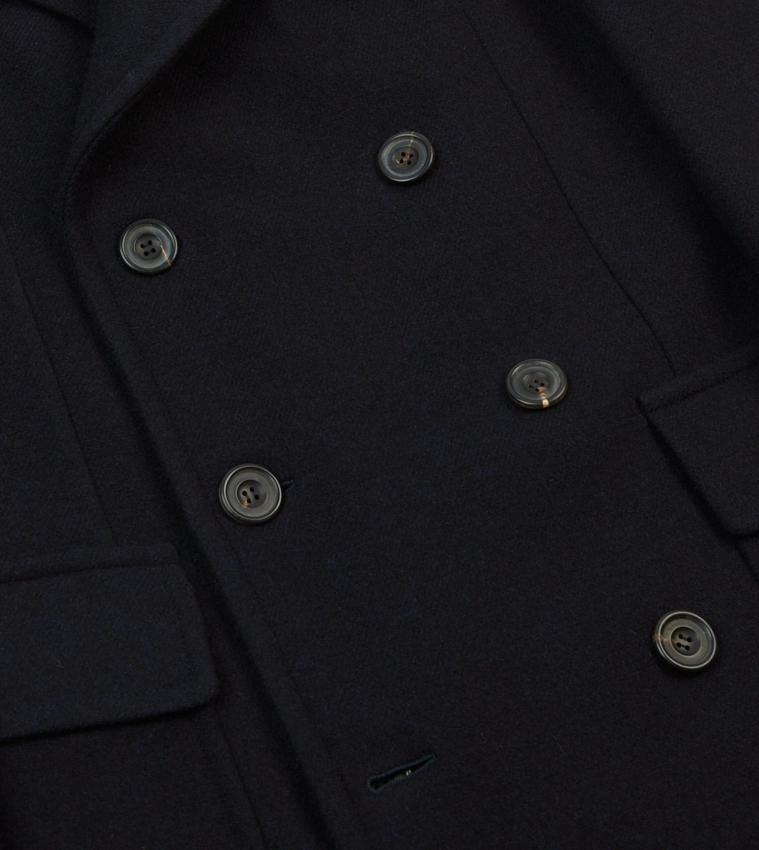 Constructed from a remarkably substantial 14.7oz lambswool cloth from Fox Brothers & Co., the coat has two accommodating outer patch pockets, a flap chest pocket, as well as two internal pockets for valuables. It closes with six weighty horn values, and a serviceable ulster collar. Whether worn over formal tailoring or rugged casualwear, this coat is irreproachable in its quality and timeless style.