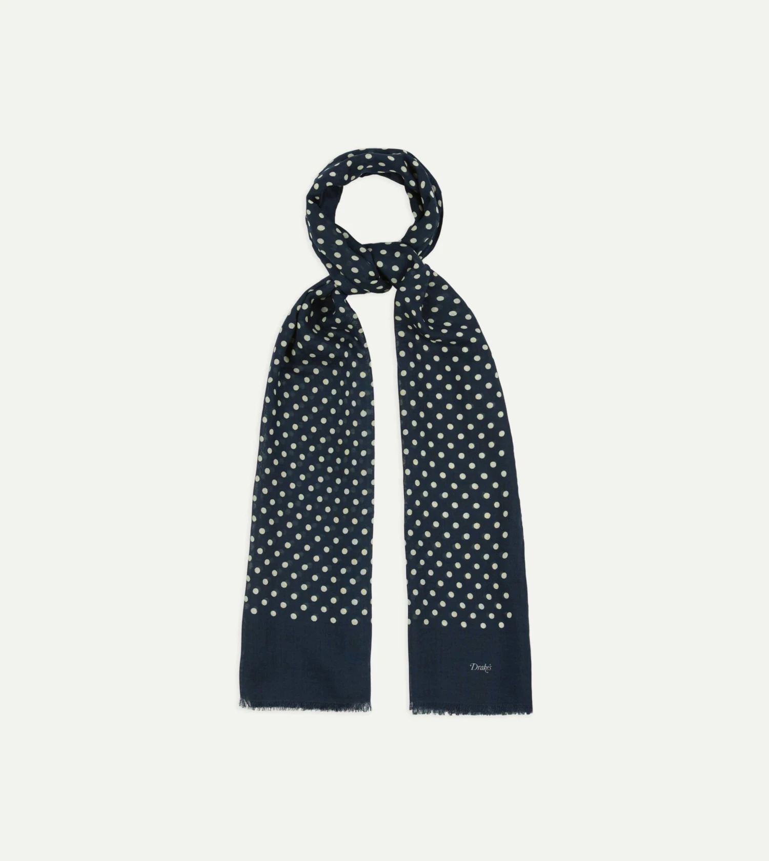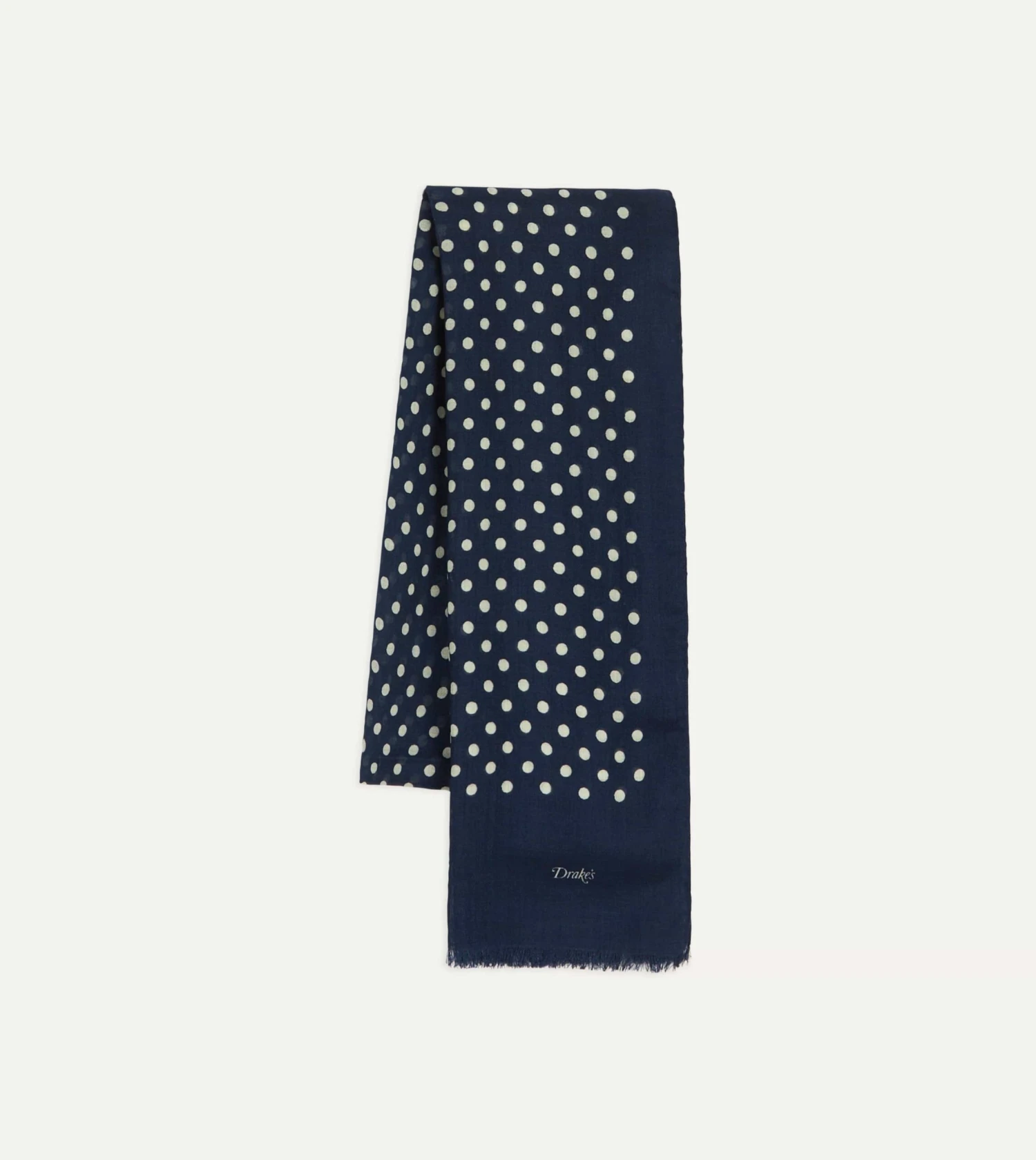 Woven from a lightweight, airy blend of wool and silk, this classic scarf is printed with a hand-drawn and slightly irregular polka dot design and features eyelash fringing at both ends for an airy addition to your cold-weather arsenal.