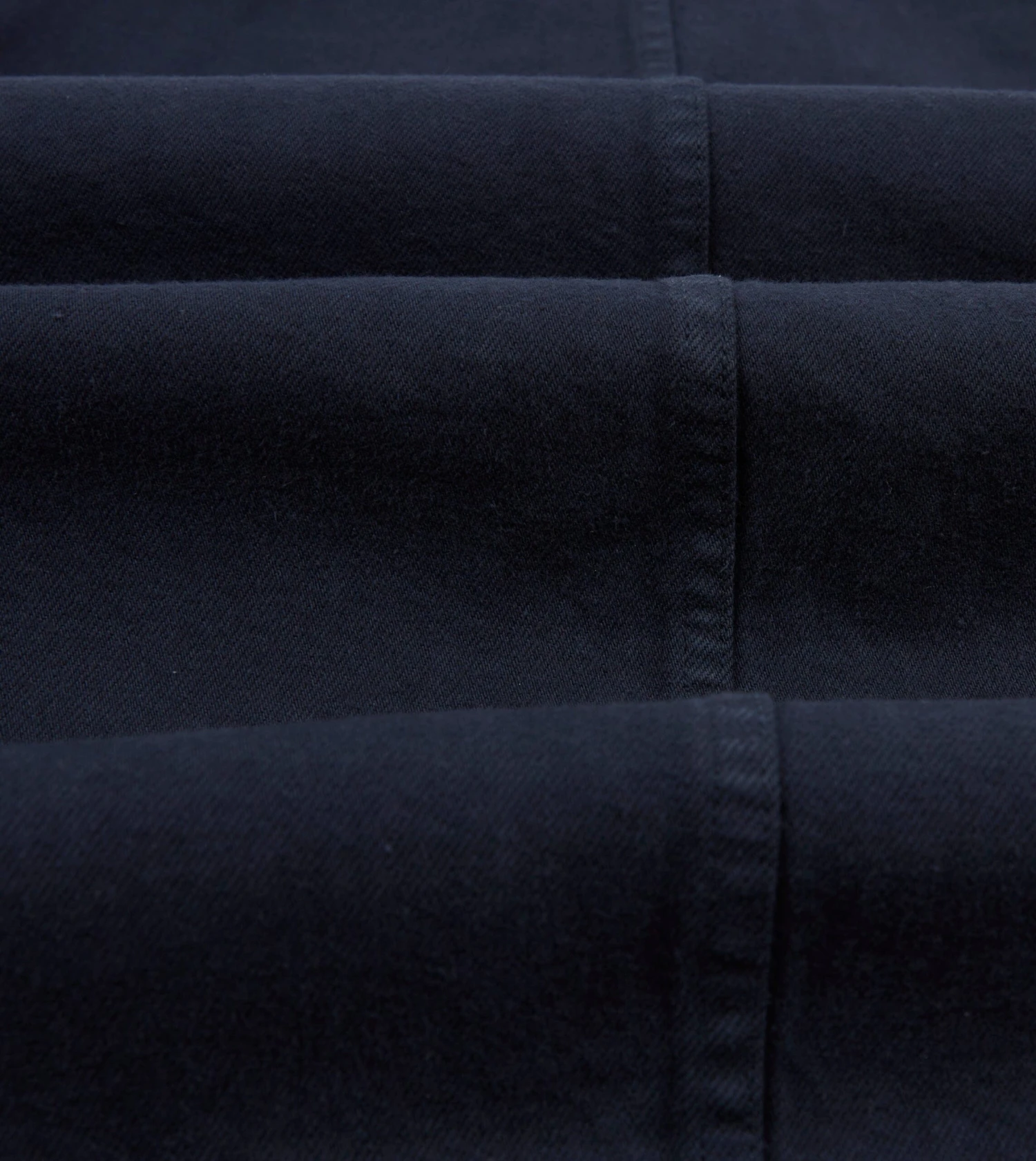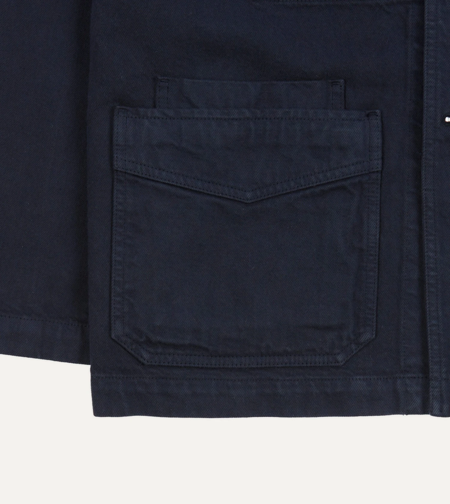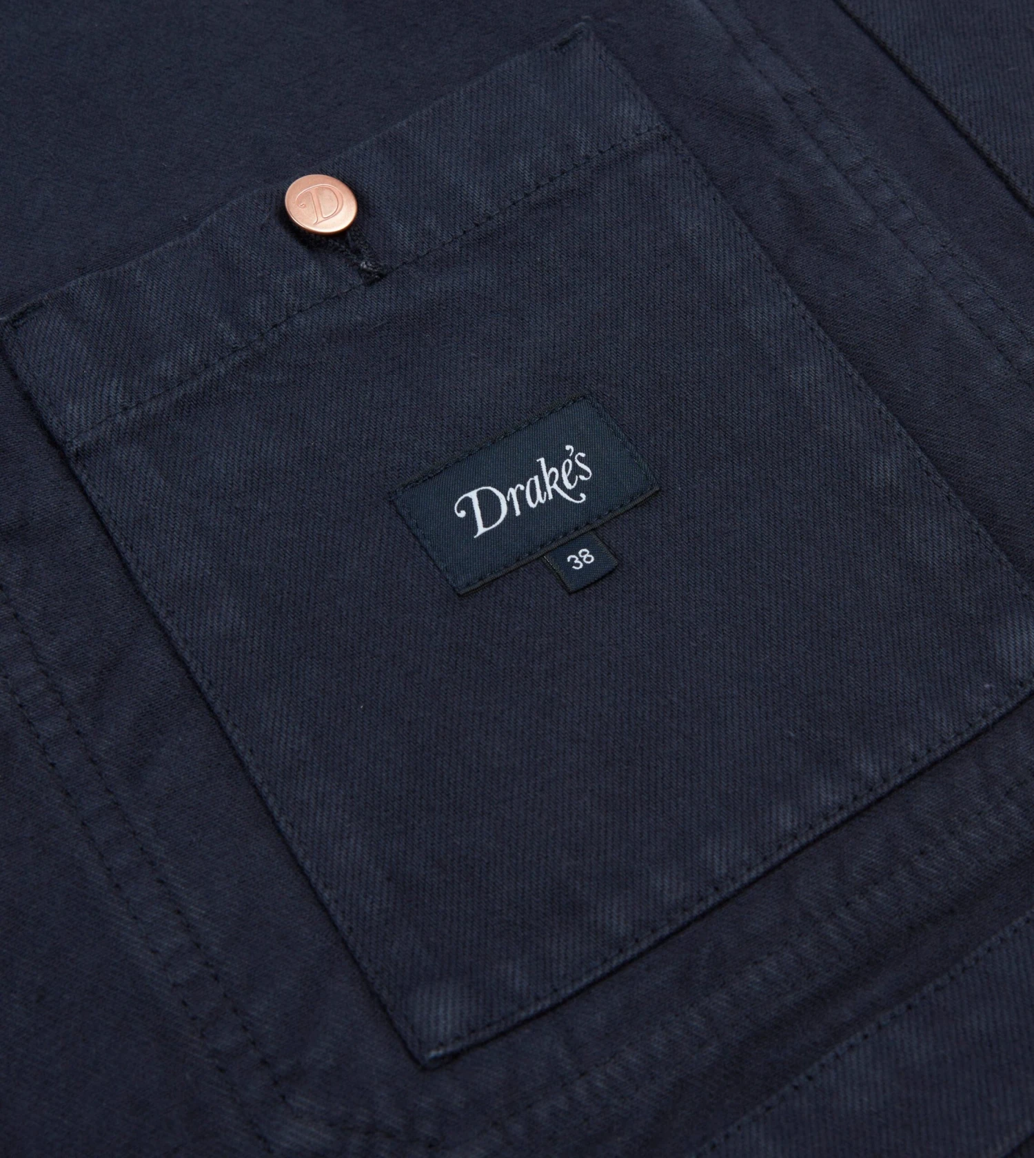 A staple of casual wardrobes the world over, the chore jacket retains its relevance on account of its stylishly spare construction, and its utmost versatility. This version is made from a heavyweight cotton twill, with three outer pockets (plus a signature Drake’s ticket pocket peaking out on the left-hand side), and one inner pocket. It is cut generously, with a slightly boxy shape recalling the original workwear garments worn around the turn of the century, as opposed to their slimmed-down, contemporary counterparts.