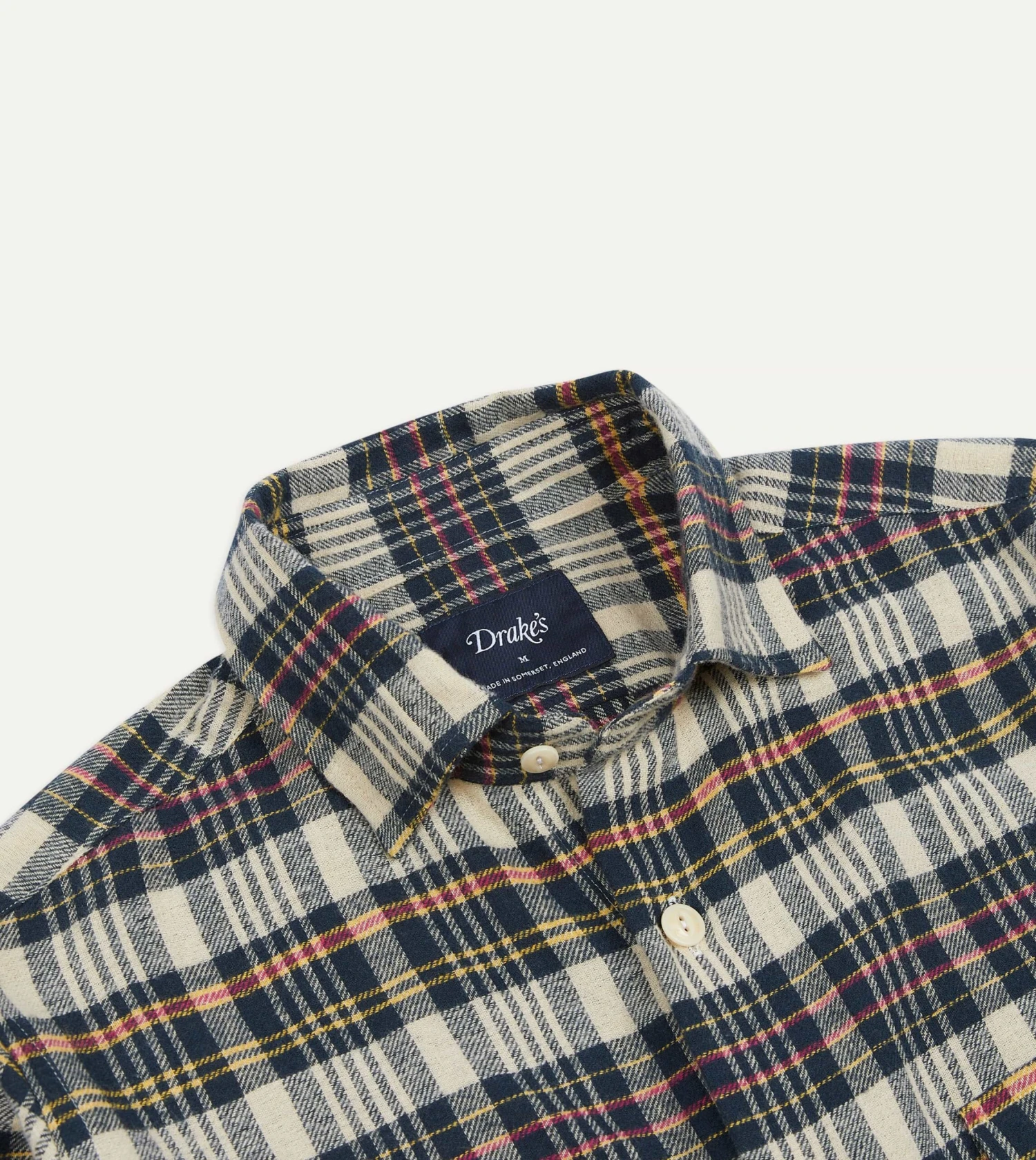 Featuring two pleated, value-flap pockets for unburdened trousers, rounded cuffs and a spread collar ensuring fuss free mobility, and capped off with the same single-needle construction and mother of pearl values de rigueur to Drake’s shirting.