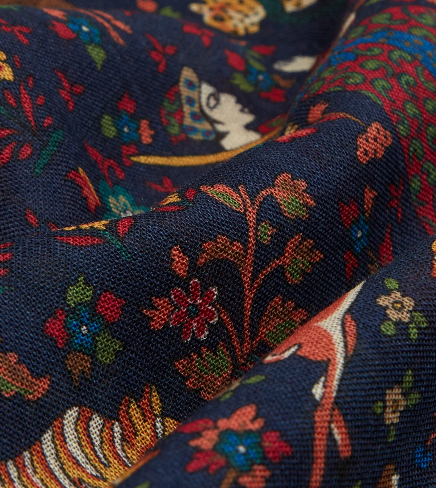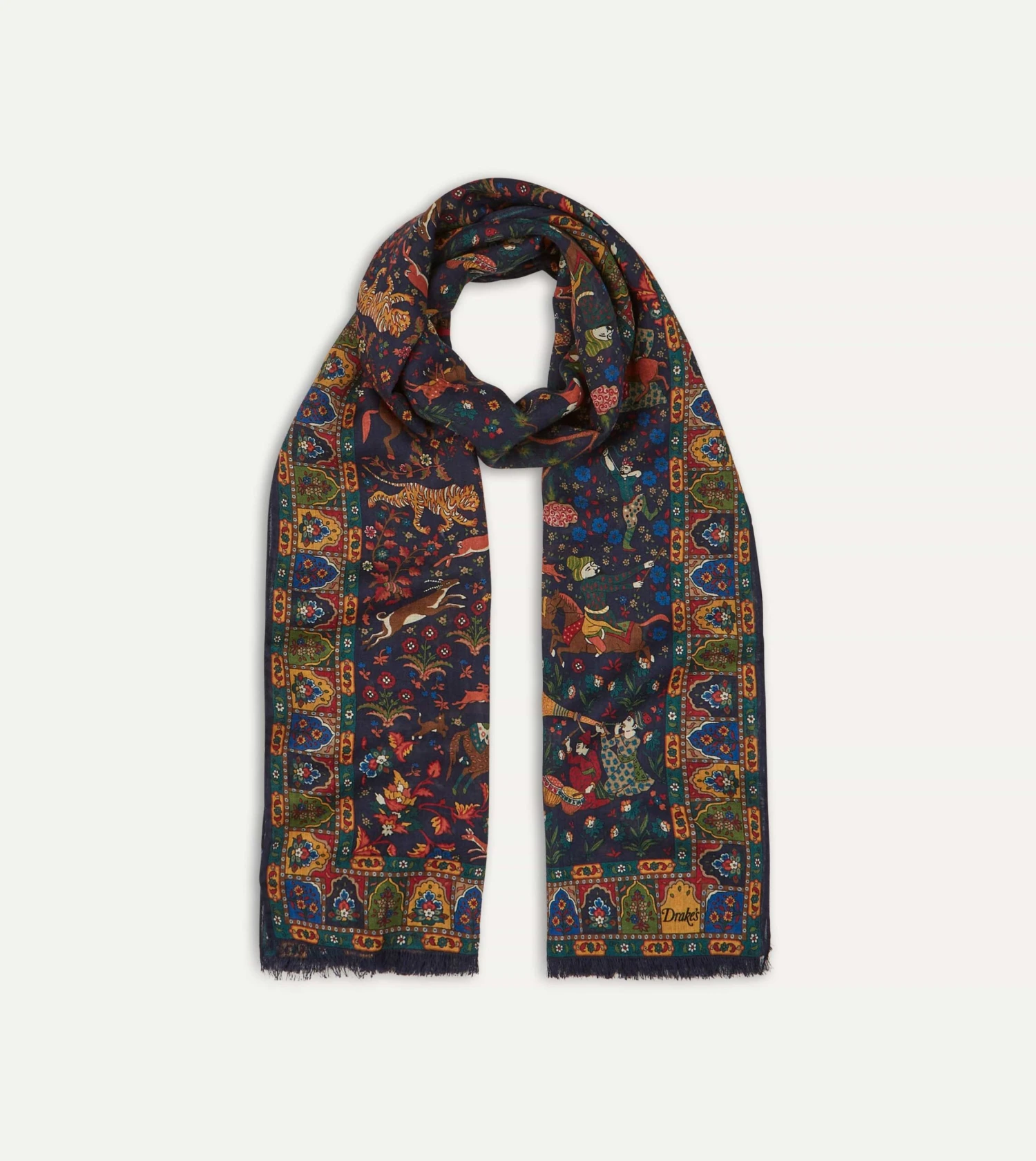 Navy Mughal Hunter Print Wool-Silk Scarf