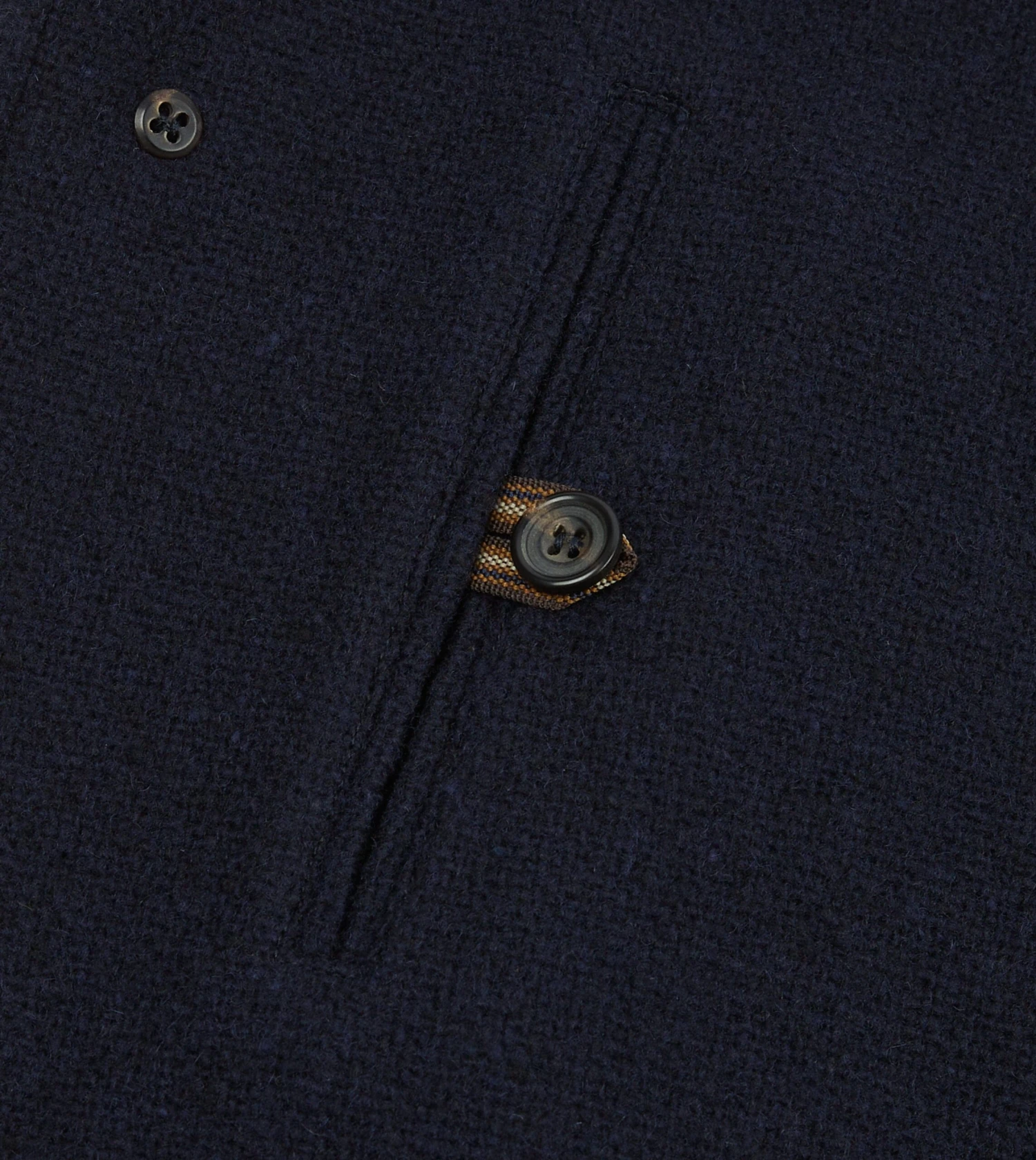 Unstructured and practical in design, the coat features a sturdy, serviceable collar and valueed sleeve straps to defend against the elements, while split raglan shoulders, a fly front and considerable rear vent offer uninhibited manoeuvrability.