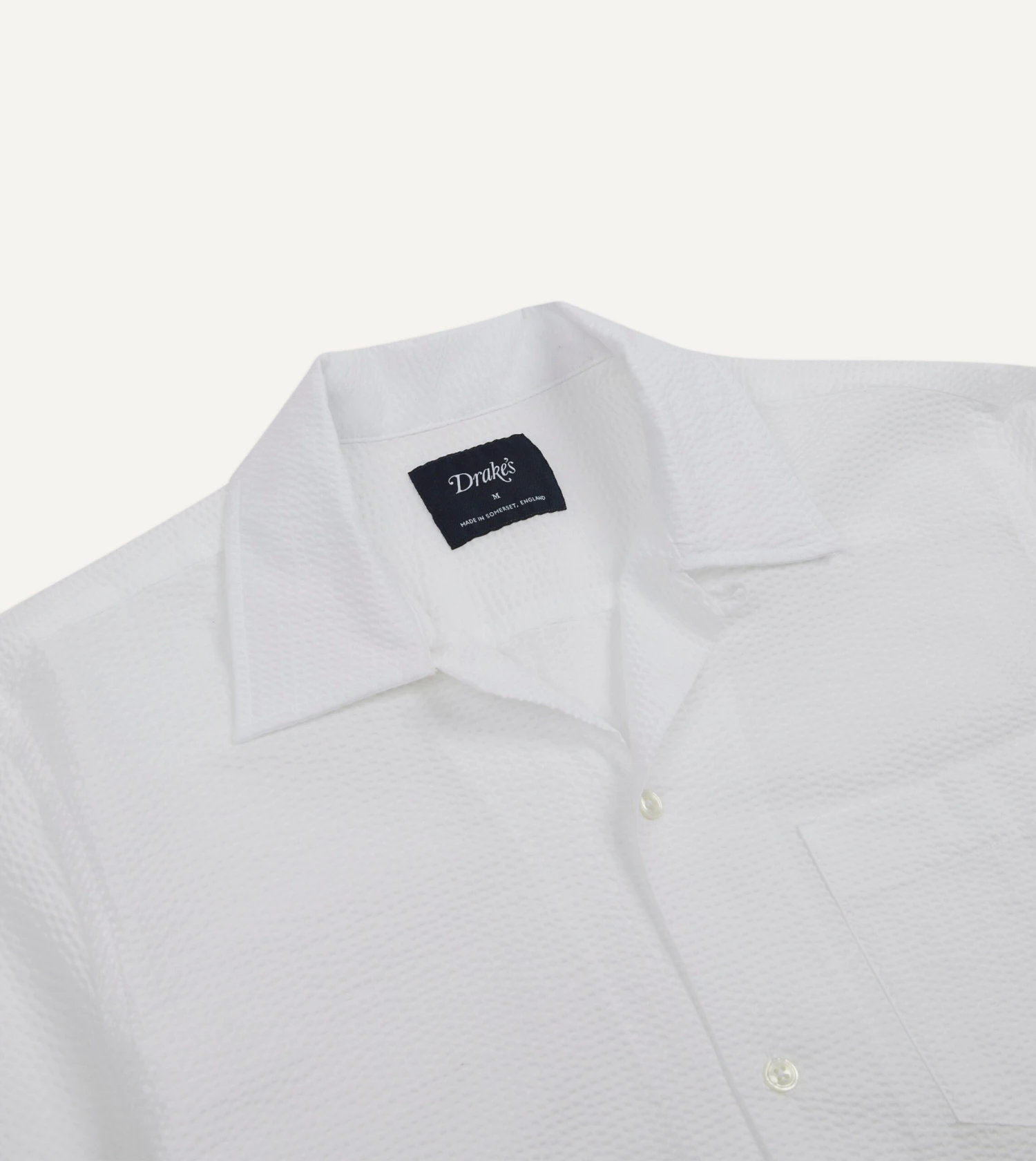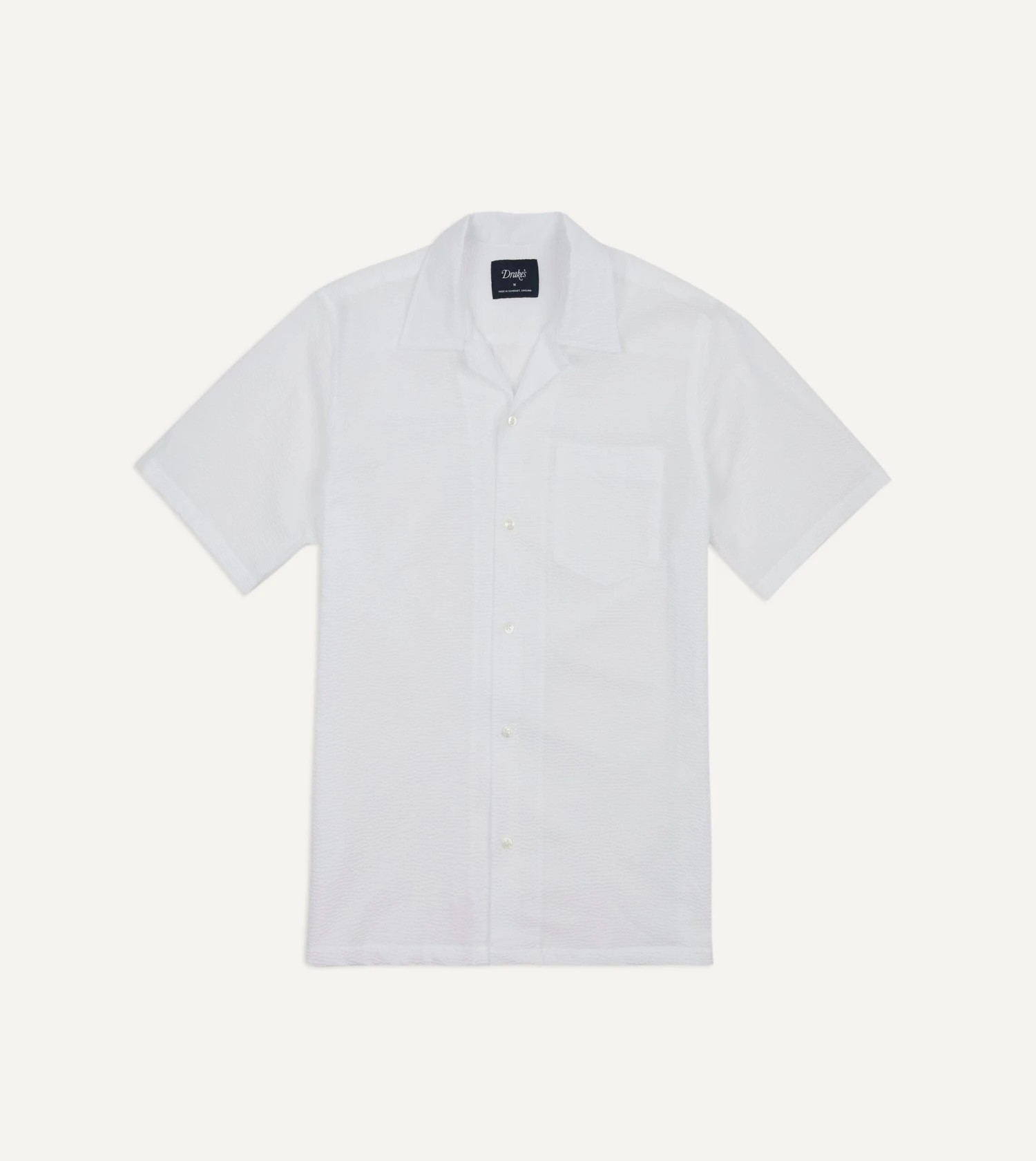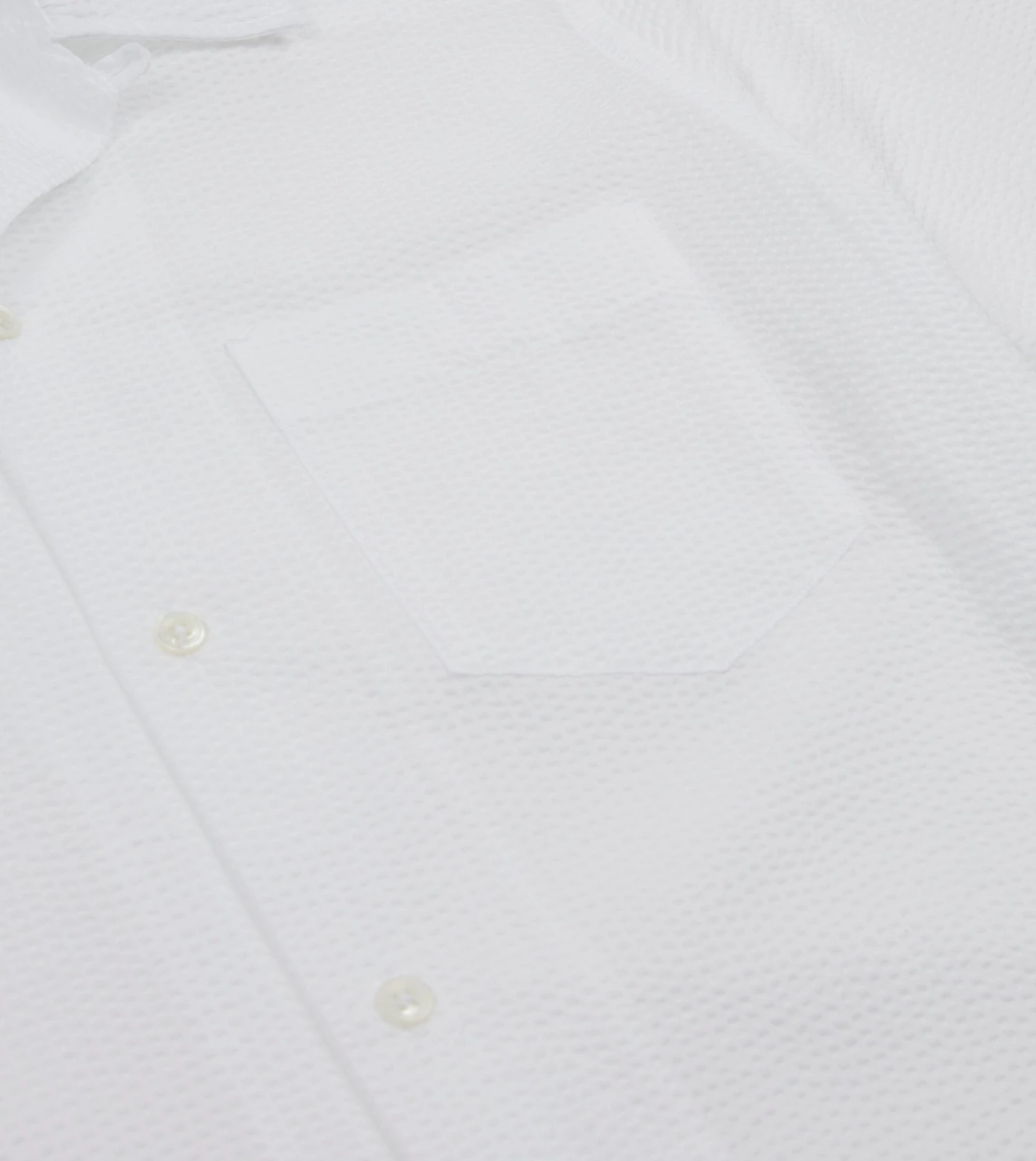 The Drake’s take on this warm weather staple brings the story up-to-date; cut with a neat open collar, loose fit, plain front and straight hemline, all constructed from a soft, breezy seersucker fabric. It is, quite simply, the quintessential high summer shirt.